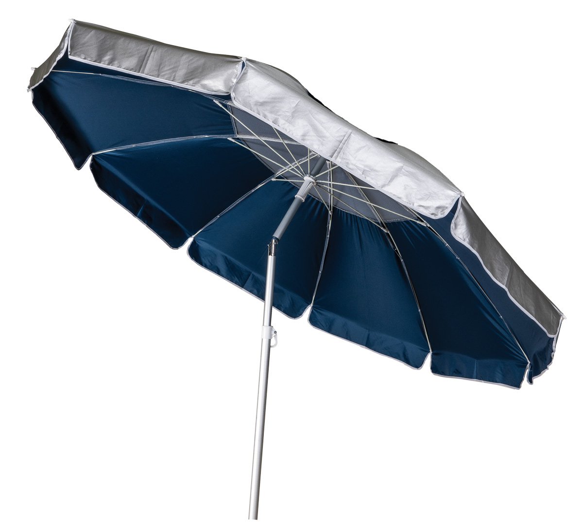 Ασημί – Μπλέ Στρογγυλή Ομπρέλα Θαλάσσης Με Κορμό Αλουμινίου Και Ακτίνες Fiberglass Με Αεραγωγό Και Θήκη Αποθήκευσης, 50% Προστασία Uv