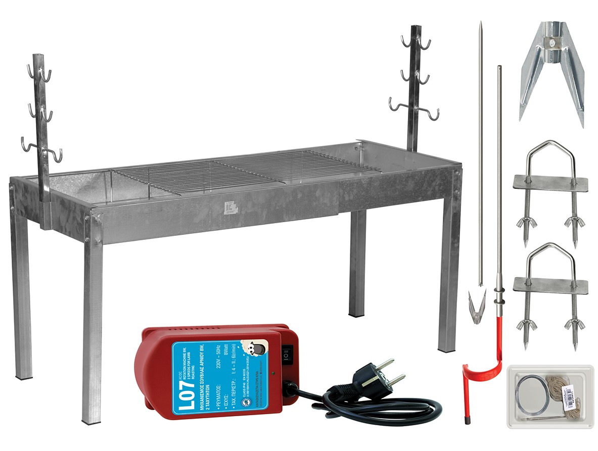 Περιλαμβάνει: Ψησταριά 145 x 50 x 63(h)cm1 Μοτέρ1 Σούβλα Σπαστή Με Χερούλι 180 cm2 Διχάλα1 Πηρούνα1 Σχάρα1 Σετ Ραψίματος