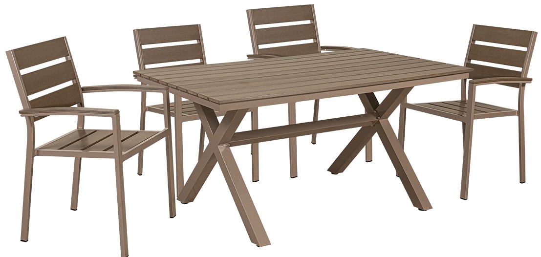 Το Σέτ Περιλαμβάνει Ένα Τραπέζι Παραλληλόγραμμο Και Τέσσερις Πολυθρόνες Στοιβαζόμενες Χαρακτηριστικά: Διάσταση Τραπεζιού: 150(L) x 90(W) x 74(H) cm Διάσταση Πολυθρόνας: 57(W) x 58(D) x 88(H) cm Υλικό Σκελετού: Αλουμινιο Υλικό Επιφάνειας: Pollywood Χρώμα Pollywood: Καφε Χρώμα Σκελετου: Καφέ