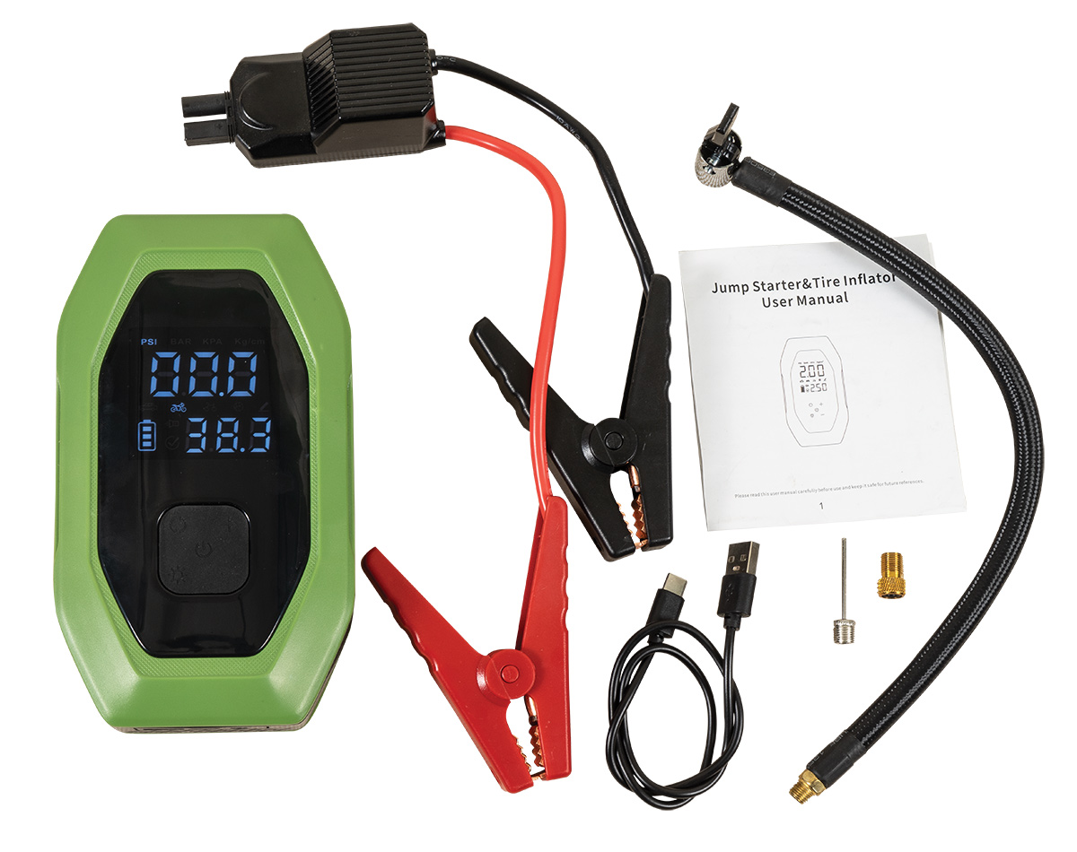 2 σε 1 ισχυρή φορητή αντλία ελαστικών & εκκινητής άλματος Μέγεθος: 17.8×10.2x 5.3cm Συμβατό για 12V βενζινοκίνητο & πετρελαιοκίνητο όχημα. Ρεύμα εκκίνησης: 500A Ρεύμα αιχμής εκκίνησης: 1000A Θερμοκρασία εργασίας: -10 ~ 45 ℃ Σφιγκτήρας: -10 ~ 45 ℃: 400A Ψηφιακή οθόνη διπλής ανάγνωσης: Προκαθορισμένη πίεση & πίεση σε πραγματικό χρόνο Αυτόματη διακοπή στην προκαθορισμένη πίεση-στόχο 5 έξυπνες λειτουργίες: Ποδήλατο/ Μοτοσικλέτα/ Αυτοκίνητο/ Μπάλα/ Χειροκίνητο Διακόπτης μονάδας μέτρησης: Psi KpaBarKg/cm² Μέγιστη πίεση αέρα: 150PSI Μέγεθος κυλίνδρου: κύλινδρος 19mmΡοή αέρα: 19mm: 19L/min LED φωτισμός έκτακτης ανάγκης με λειτουργία τράπεζας ενέργειας Ενσωματωμένη μπαταρία Li-polymer: 4x 2000mah Χρόνος φόρτισης: 3 – 5 ώρες Χρόνος αντοχής: 25 – 30 λεπτά