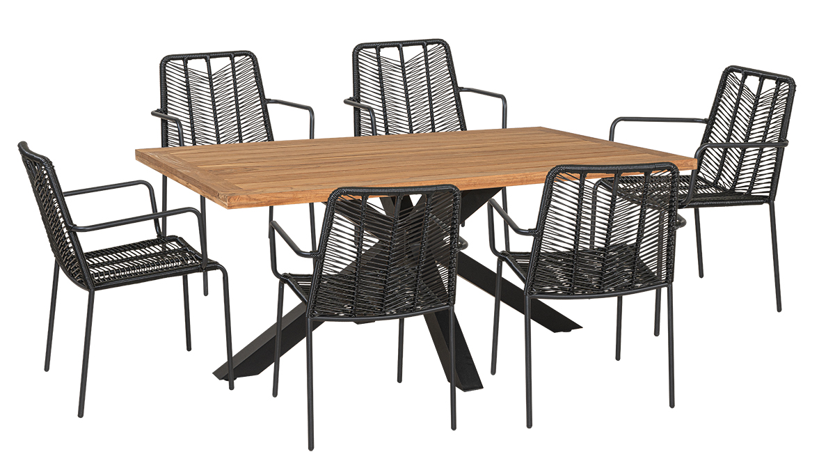 Περιλαμβάνονται: 1 Τραπέζι Παραλ/μο Διαστάσεις: 180 x 100 x 75(h)cm 6 Πολυθρόνες Μεταλλικές Στοιβαζόμενες Με Rattan Διαστάσεις: 51 x 55 x 85(h)cm