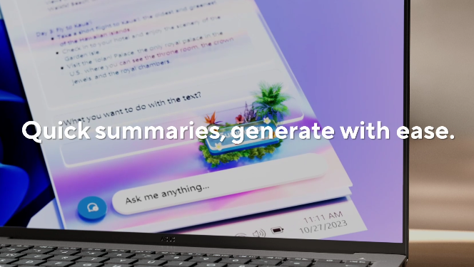 Σκέψου πιο έξυπνα, δράσε πιο γρήγορα με τους υπολογιστές Copilot+. Ο AI βοηθός Copilot σε υποστηρίζει με έξυπνη αναζήτηση, γρήγορες περιλήψεις και οργάνωση εργασιών. Με το Recall βρίσκεις αρχεία περιγράφοντάς τα, ενώ το Cocreator στο Paint ζωντανεύει τα σχέδιά σου. Οι Live Captions μεταφράζουν την ομιλία σε πραγματικό χρόνο και τα Windows Studio Effects βελτιώνουν την εικόνα σου σε κάθε βιντεοκλήση.