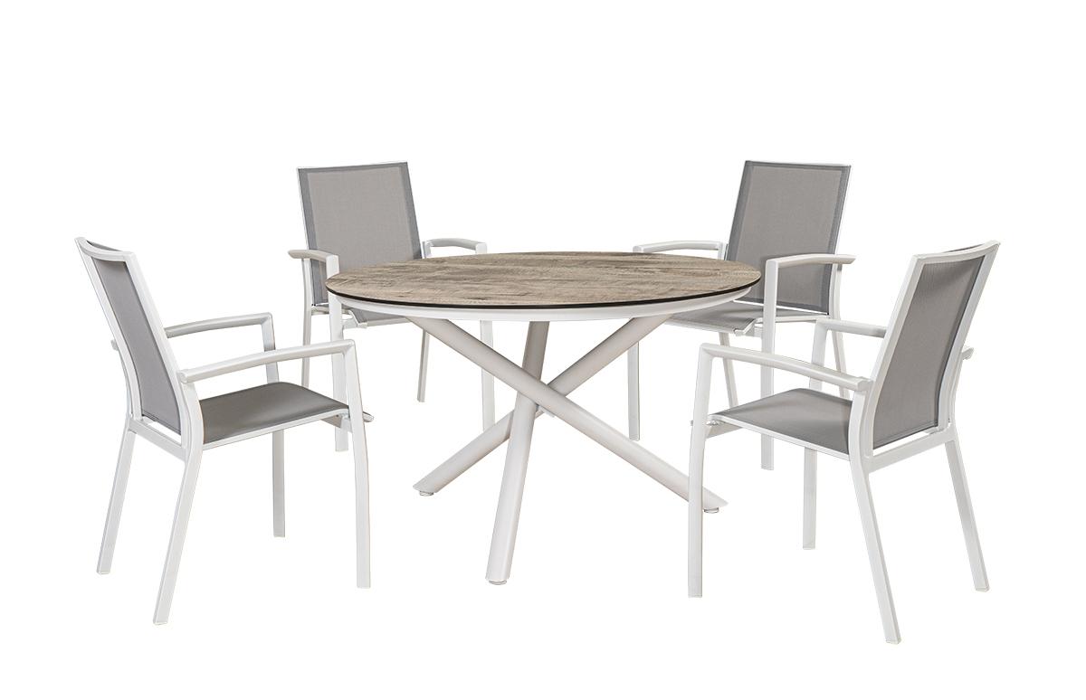 Το Σέτ Περιλαμβάνει Ένα Τραπέζι Παραλληλόγραμμο Με Επιφάνεια Compact Hpl Και Τέσσερις Πολυθρόνες Με Διάτρητο Ύφασμα Χαρακτηριστικά: Διάσταση Τραπεζιού: 120 x 75 (H) cm Διάσταση Πολυθρόνας: 56.5(W) x 62(D) x 89(H) cm Υλικό Σκελετού: Αλουμινιο